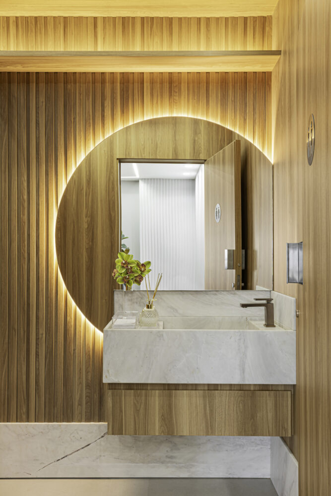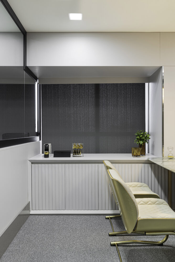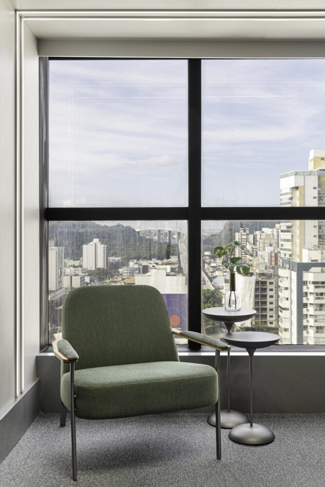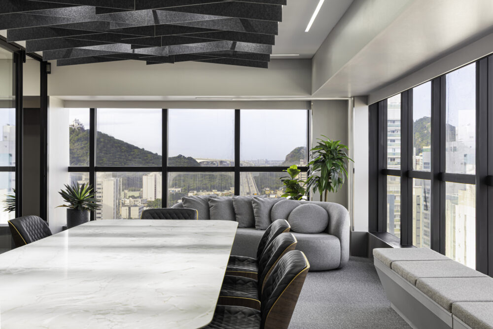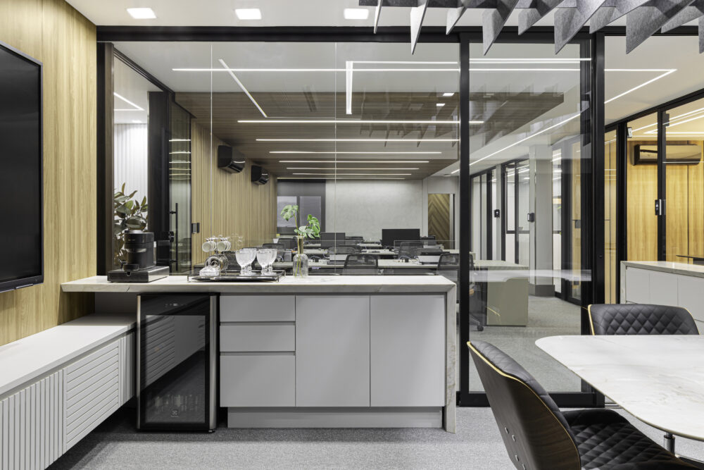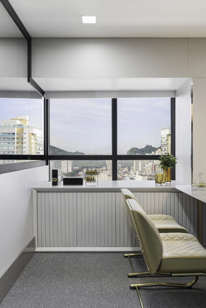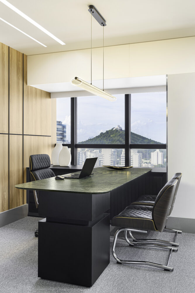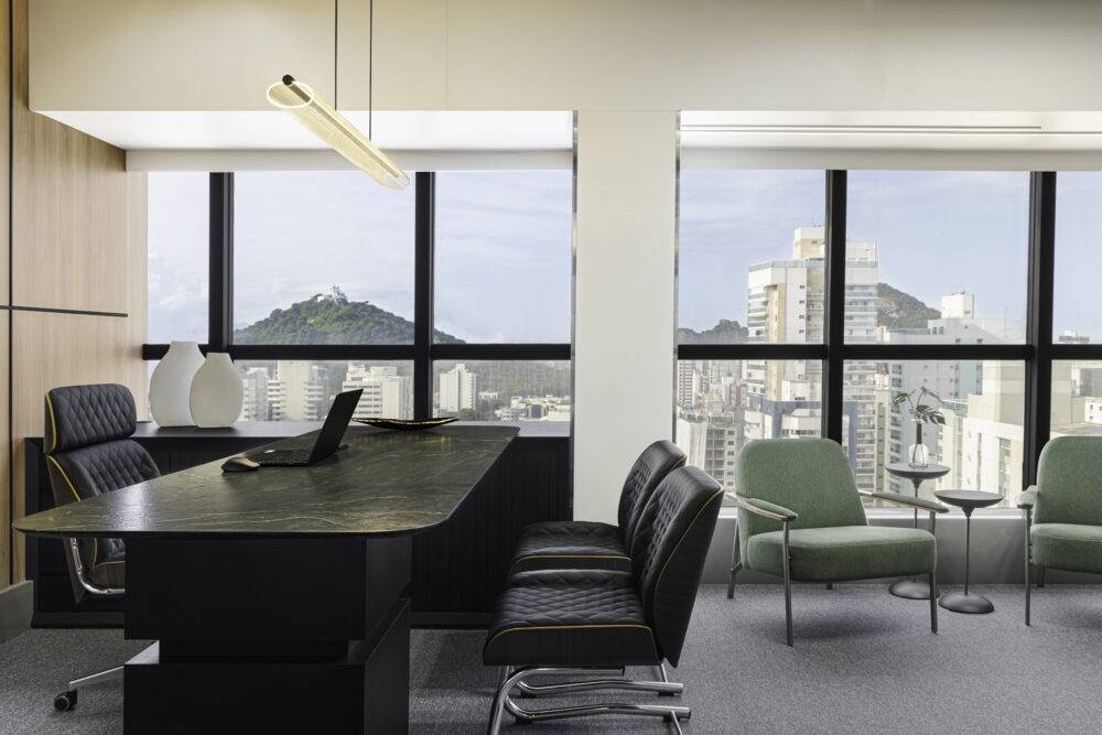 Assinado pela arquiteta Larissa Villaschi (@larissavillaschi.arq), o projeto valorizou ao máximo a paisagem privilegiada com ambientes integrados, divisórias de vidro e uma ampla área operacional equipada com mobiliário Marelli, fornecido pela Workline.
