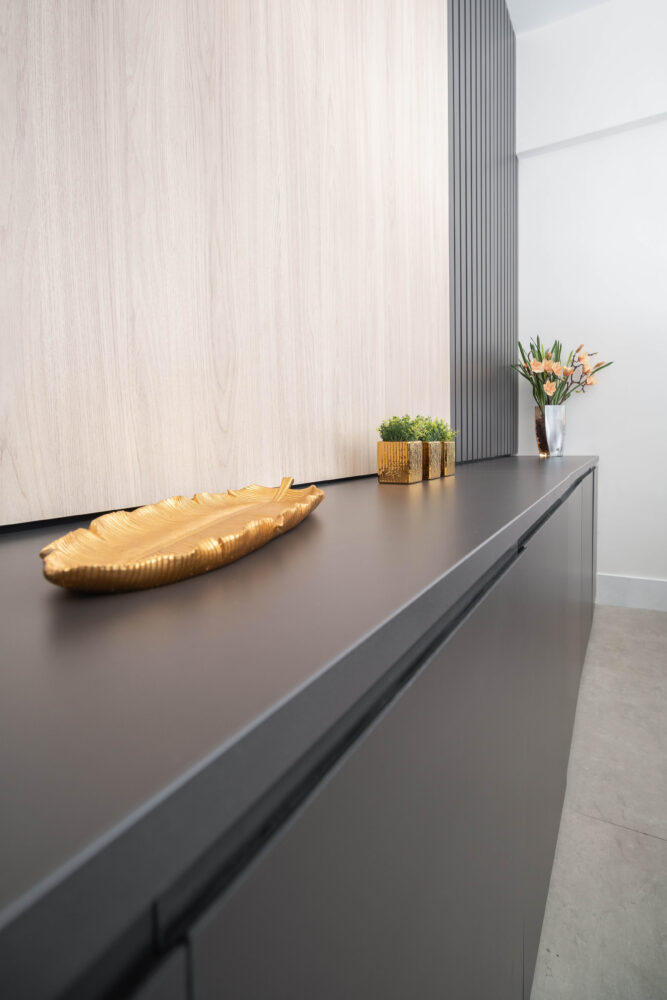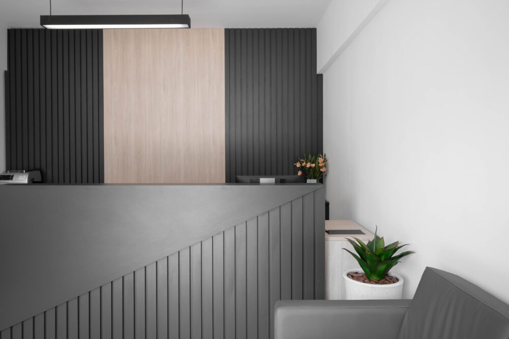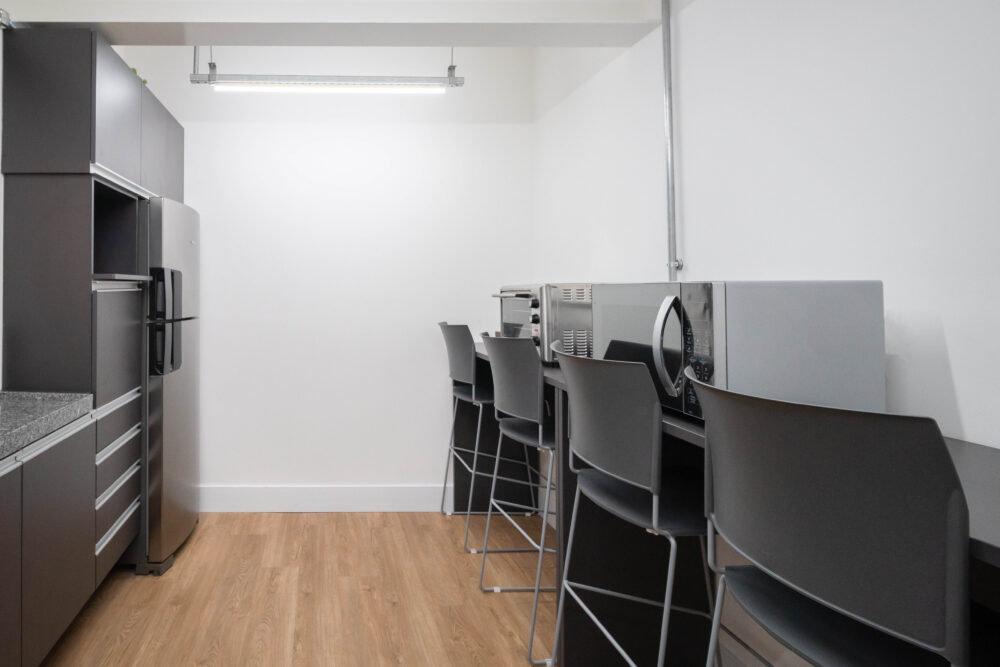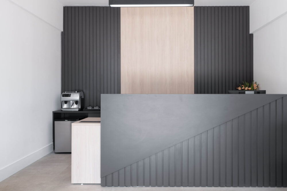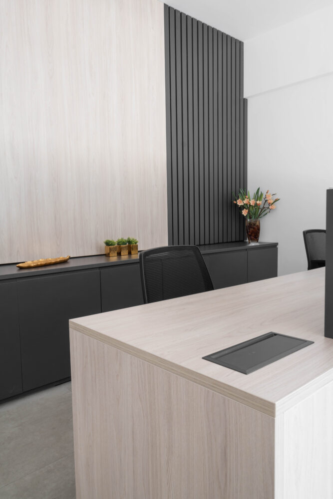 Nos ambientes de apoio, os armários da linha Arquivamento proporcionam organização e durabilidade. A marcenaria sob medida também foi destaque: o painel e balcão da recepção, assim como os armários da copa, foram fornecidos pela fábrica Sanel, agregando sofisticação e funcionalidade.