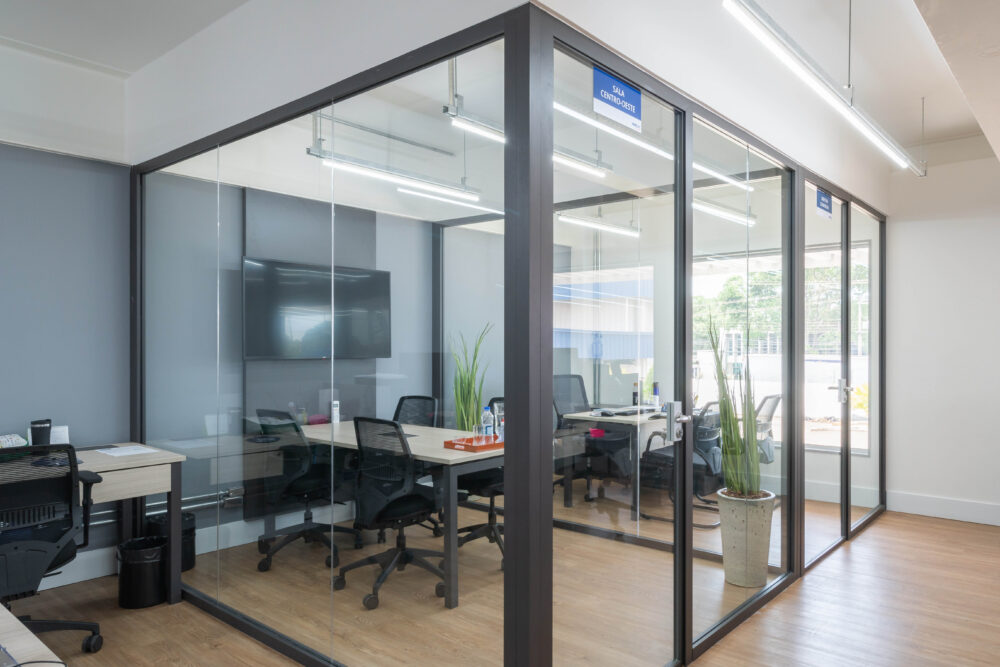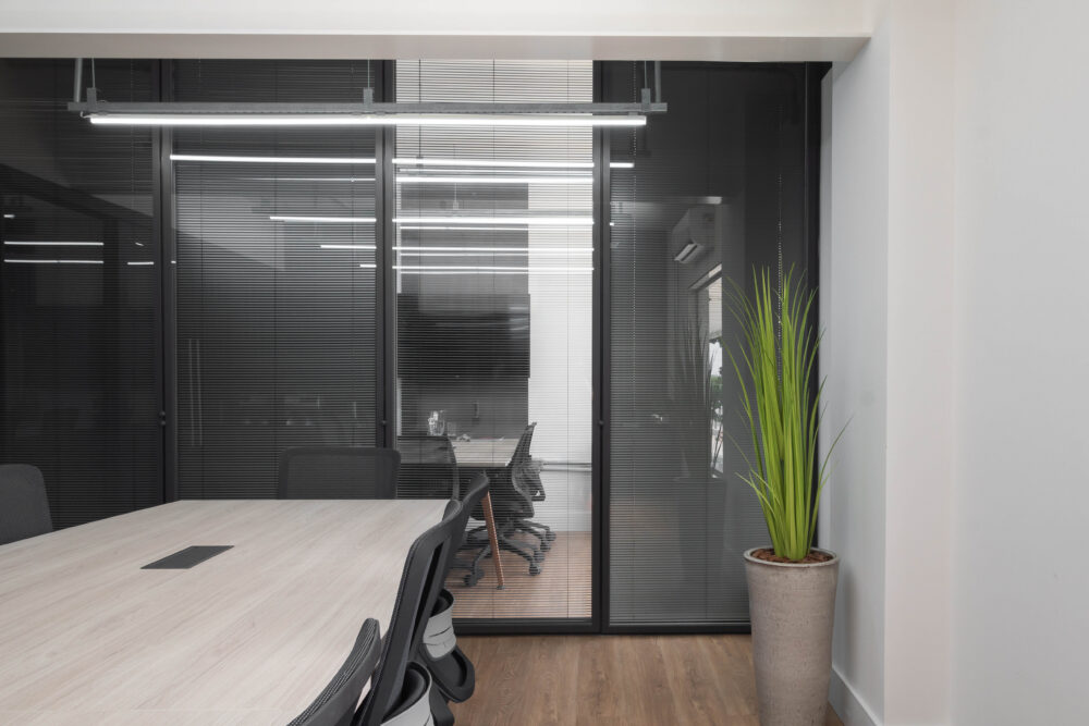 As divisórias piso-teto foram escolhidas para garantir elegância e praticidade. As salas de reunião receberam a linha Linear com persiana interna embutida, promovendo controle de privacidade com design clean. Já os demais ambientes foram configurados com divisórias da linha Time, reforçando a padronização visual e a integração dos espaços.