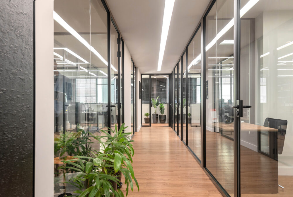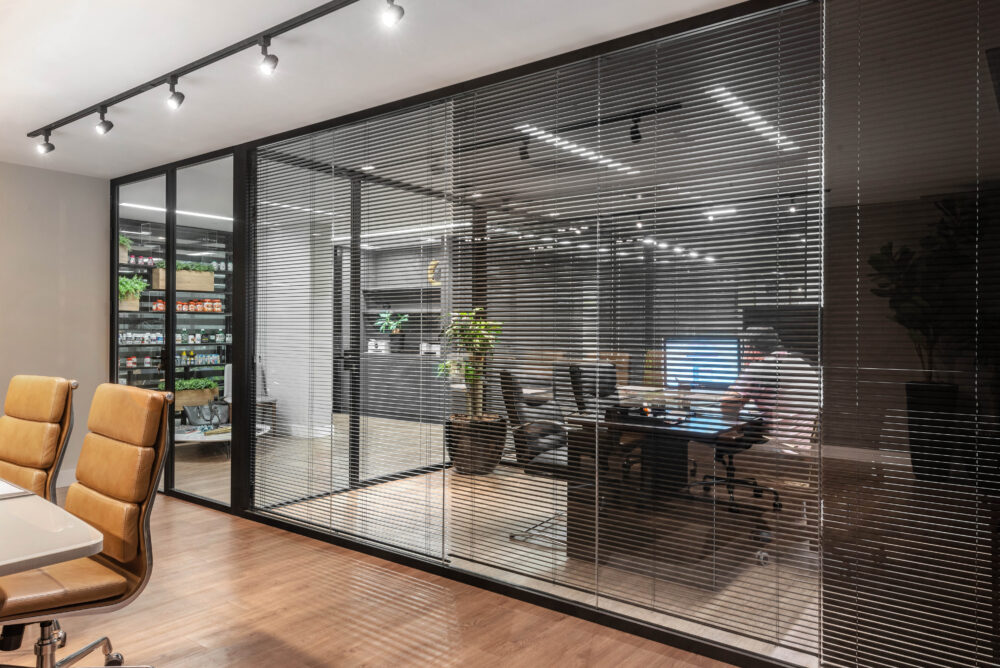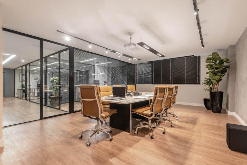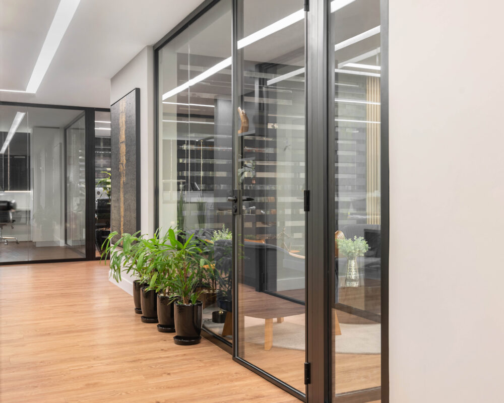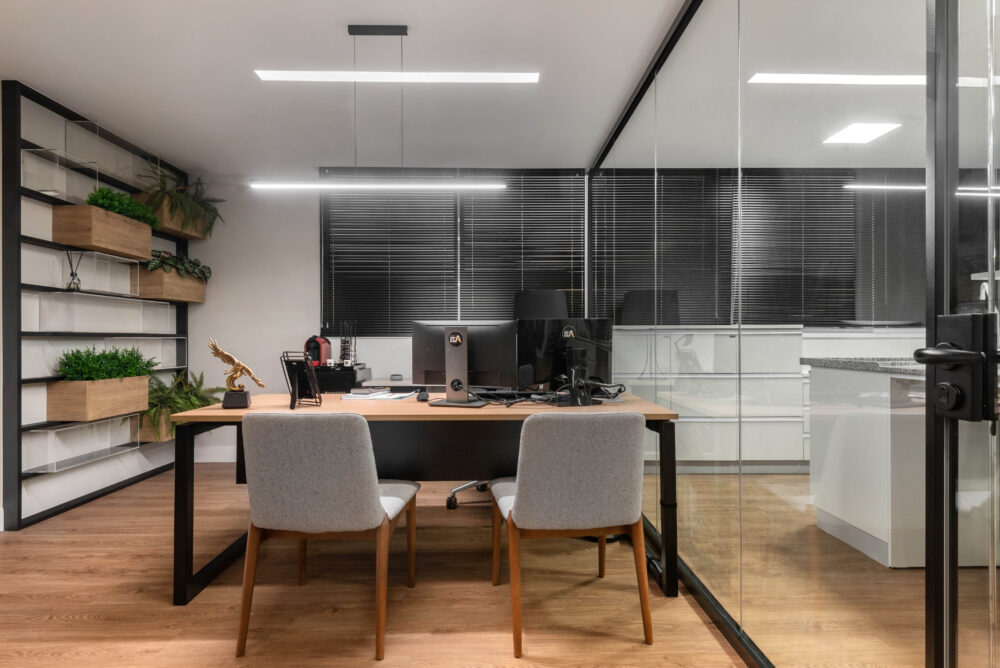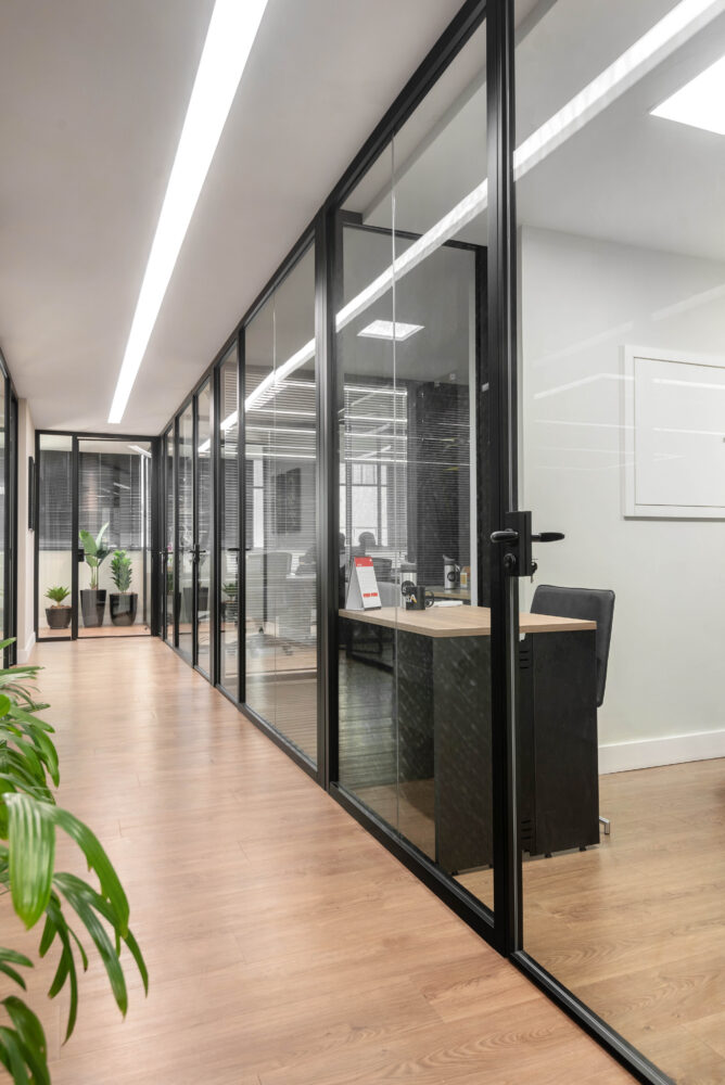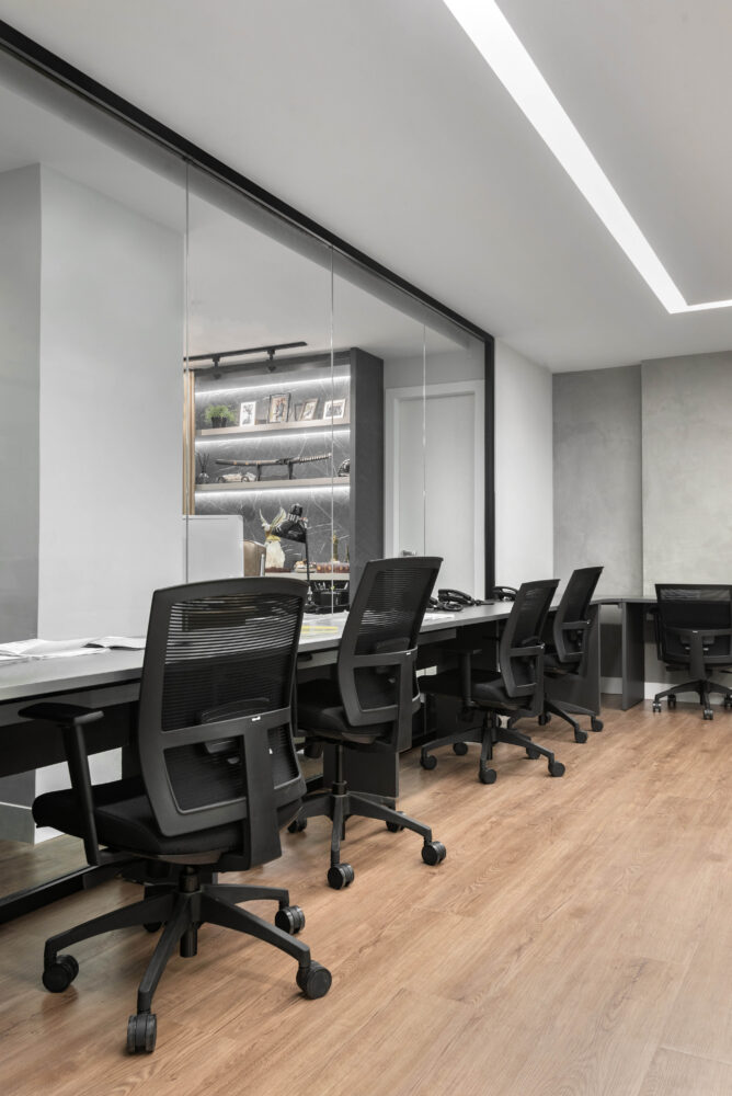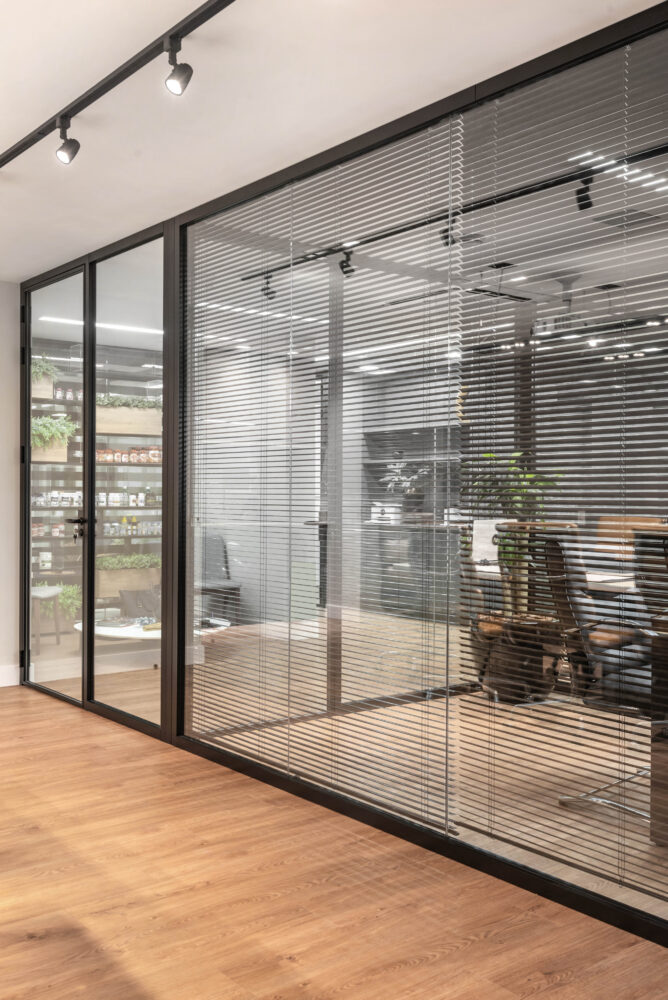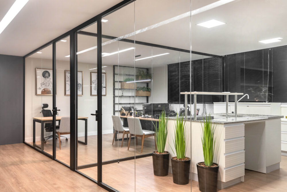 As divisórias piso-teto da linha Time, com vidro 10mm e junta seca entre vidros, foram escolhidas para oferecer um visual mais limpo e contemporâneo, reforçando a sensação de amplitude e transparência nos ambientes.