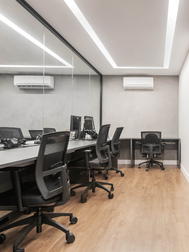 Na área operacional, utilizamos estações da linha Fine com pé painel, em acabamento grafite, que garantem robustez e sofisticação ao espaço. As cadeiras escolhidas foram da linha Pro-Fit, com estrutura preta, encosto em tela e assento em tecido, aliando ergonomia e leveza.